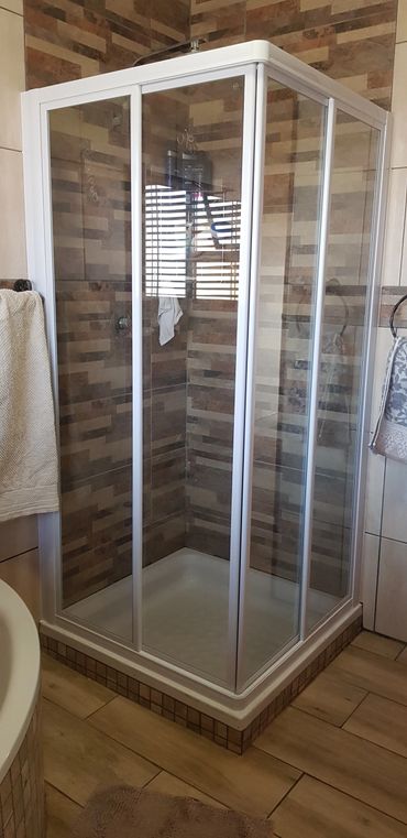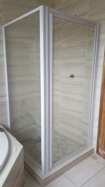 These showers are ideal for small or unusual spaces or corners. Available in natural anodized and white powder coated with either clear toughened or obscure toughened glass.